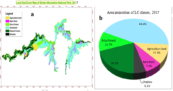 Based on their increasing order of percent coverage for the year 2017 land classification, barren land took the first rank followed by shadow, Erica forest, agricultural land, montane forest and grassland respectively. For the year 2017, the land use distribution map and the percent area cover for each land use are presented in Figure 3a and b respectively.