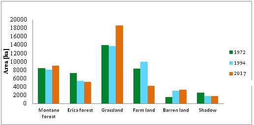 Land use classes showed variable extent of changes throughout the study period Figure 4. In the 1st reference period (1972 - 1994), agricultural (9945.56 ha) and barren land (3066.6 ha) showed a remarkable increase whereas montane forest (8040.69 ha), Erica forest (5446.3 ha), grassland (13693 ha) and shadow (1792.5 ha) showed shrinkage. In the second reference period (1994 - 2017), montane forest, grassland and shadow showed increasing trend with the dramatic increase in grassland at the cost of farm lands. Erica forest and farmlands land showed a decreasing tendency with a dramatic shrinkage in agricultural land.