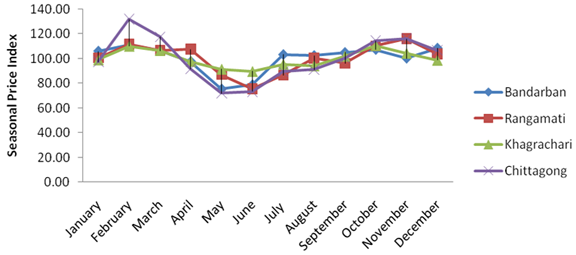 The outcomes of the empirical assessment of spatial price linkage through correlation coefficients and co-integration among selected markets of Bangladesh using the wholesale price of selected vegetables mentioned that these markets were well integrated but not strongly integrated. That means the Chittagong market for each commodity was significantly integrated but not significantly highly integrated because of less developed carrying system in the hilly areas. The average seasonal price variation of brinjal was the highest in the month of October and the lowest in the month of March. The average seasonal price variation of yard long bean was the highest in the month of February and lowest in the month of June. Based on the overall outcomes of the study, it can be accomplished apparently that substantial scope exists to augment the output of high-value vegetables and to enlarge the value chain. Therefore, the producers and market actors could surely be assisted monetarily if the production and marketing system of vegetables are well managed.
