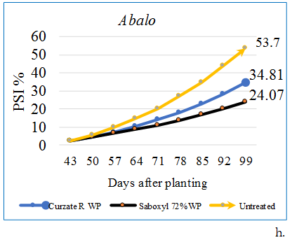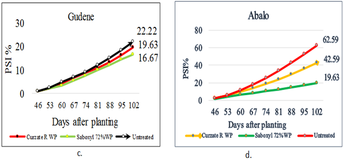 Analysis of percent severity index (PSI %) revealed highly significant (p<0.01) difference among the interaction of varieties and fungicides starting from 50 and 53 DAP at Adet and Debre-Tabor, respectively Figure 1 and Figure 2. While at the initial date of assessment (43 and 46 DAP) only the main effect of varieties showed significant difference but the fungicide and the interaction effects were non-significant (P>0.05) at both sites of the experiment, because the fungicides at this stage were not applied. The highest PSI obtained at 43 and 46 DAP of Adet and Debre-Tabor was 2.22% on Abalo and 1.85% on Guassa at Adet, whereas, the other varieties have only 1.11%. The maximum PSI (%) was recorded from untreated Abalo at each date of assessment from both sites followed by unsprayed Guassa at Adet and Abalo combined with Curzate R WP fungicide at Debre-Tabor Figure 1 and Figure 2. Even though, the disease was appeared lately on Belete the progress was nearly similar with variety Guassa and even faster after 88 DAP at Debre-Tabor Figure 1. The final PSI of the plots with different fungicide applications ranged from the least (16.67 and 11.11%) for the variety Belete and Gudene sprayed by Saboxyl 72% WP to the highest (62.59 and 53.7%) PSI % for the unsprayed Abalo from Debre-Tabor and Adet, respectively Figure 1 and Figure 2. However, the magnitude of disease severity was significantly different among varieties that was higher on Abalo than Guassa and moderately resistant varieties (Belete and Gudene) at both sites. This result coincides with the findings of Olanya et al. (2001) that late blight severity in fungicide treated plots was very low, however, it was highest in the untreated plots of susceptible variety, and also Bekele and Hailu (2001) reported that the highest disease severity has found on the unsprayed susceptible variety (Alemaya-624) as compared to on the tolerant variety (Tolcha).