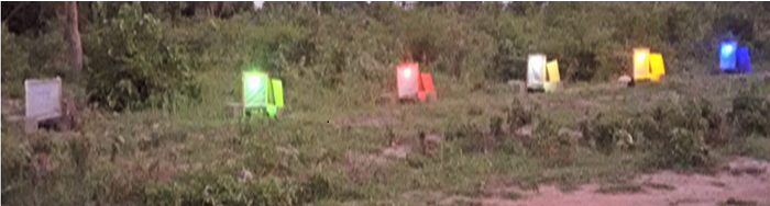 Figure-1. Showing light traps setup [Trap 1: control, Trap 2: green, Trap 3: red, Trap 4: white, Trap 5: yellow and Trap 6: blue] spaced 3 m apart in the field (Traps are numbered from left to right).