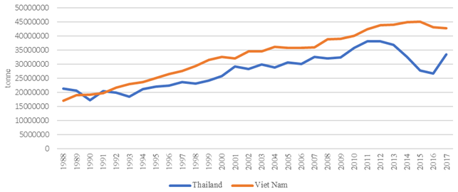 Figure 3 shows the production of paddy rice of both countries rapidly increased between 1988 and 2017. However, for six years (2011–2016), production of paddy rice of Thailand tended to decrease by 12 million tonnes from 3.8 million tonnes in 2011 to 2.6 million tonnes in 2016. From 1990, Viet Nam has overcome Thailand in terms of producing paddy rice. By 2017, production of paddy rice of Viet Nam reached more than 4.2 million tonnes, while production of Thailand accounted for more than 3.3 million tonnes.