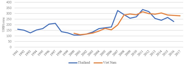 As seen in Figure 4, price of paddy rice of both countries tended to go up from 2001 to 2017. For seven years (2002–2008), price of paddy rice of Thailand was higher than that of Viet Nam. However, from 2013 onward, price of paddy rice of Viet Nam was higher than that of Thailand about US$22–55.
