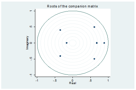Stability is an important characteristic of the VAR model, which generates stationary time series with time-invariant means, variances, and covariance structure, given sufficient starting values. This characteristic can be checked with the following equation: