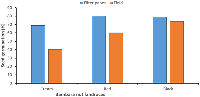 Seed germination on filter paper was higher than seeds planted in the field Figure 1. Germination on filter paper using blotter method ranged from 68.9 – 80 %, compared with average of seed germination from the two seasons which ranged from 40.4 - 72.3 %. Only 40.4 % of Cream germinated when planted in the field compared to 68.9 % on filter paper, and 60.2 % of Red germinated in the field compared to 80 % on filter paper. Black remained the highest with over 70 % germination in both field and laboratory tests.