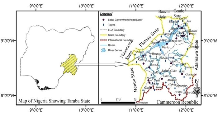 Taraba State was carved out of the former Gongola State on 27th August 1991 by the then regime of General Ibrahim Babangida. The State is one of the Nigerian thirty-six (36) state located in North-Eastern part of the country and has a coordinate of latitude 6o30’ and 8o30’ North of equator and longitude 9o00’ and 12o 00’ East of the Greenwich meridian Figure 1.