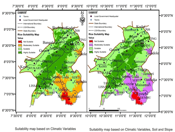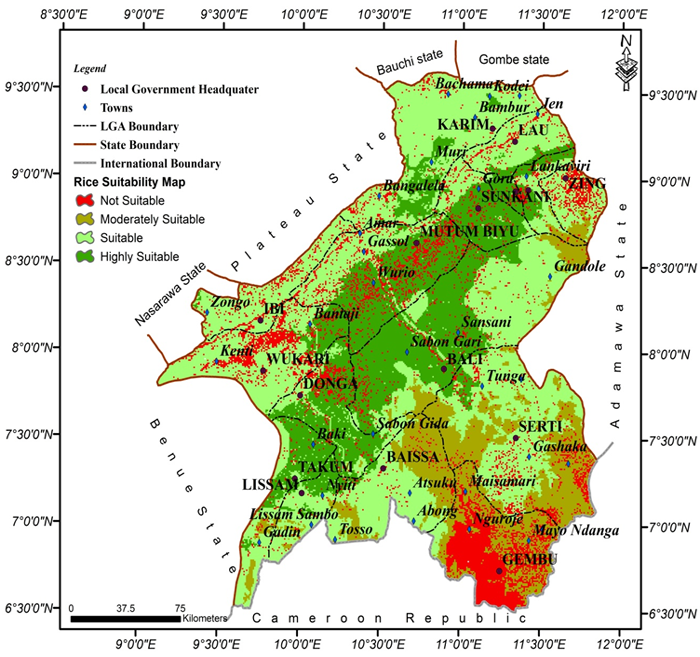 The suitability map for cultivation of rice based on Agro-climatic, soil and slop of the area revealed that the suitable area has the highest total land area of 28,489.08km2 (48.17%) followed by the highly suitable area which occupied 31.93% of the total land area of the State and include places such as; Muri, Jalingo, Sunkani, Mutum Biyu, Wurio, Bantaji, Wukari, Donga, Sabon Gari, Sansani and Bali. The not suitable area, on the other hand, has the smallest fraction of 6.78% and covered places like Gembu, Mayo Ndanga, Nguroje and Mai Samari.