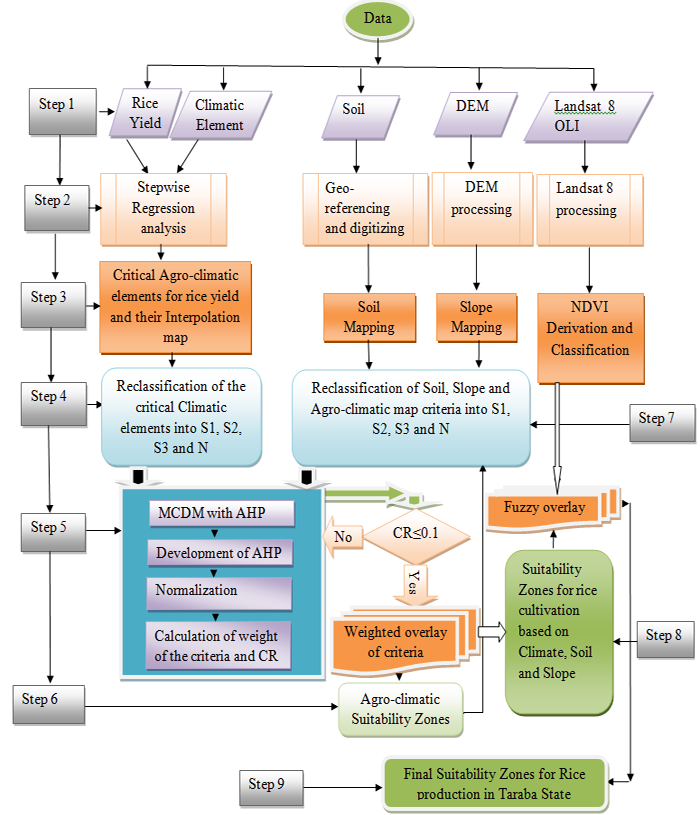 This research was aim at applying Multi-Criteria Decision Making (MCDM) in Agro-Climatic Zoning of Taraba State for rice Production. Climatic variables, Rice Yield, Digital Elevation Model (DEM), Land Sat 8 (OLI) and Soil Texture map were the data used. Climatic data of the state were analyzed over time and Space using trend and spatial analysis tools in excel and Arc GIS respectively, while correlation and stepwise regression analysis between rice yield and the climatic variables were analyzed in SPSS. Mean temperature, August and September rainfalls were identified to be the critical Climatic factors affecting the growth and yield of rice in the State. The highly suitable cover places such as; Lisasam, Takum, Donga, Wukari, Mutum Biyu and Bali while the suitable area occupy places like Serti, Lau, Sunkani, Jalingo and Lankaviri. Suitability map produced with NDVI showed that the highly suitable area for Rice cultivation reduced from 31.93% to 28.76%. In regards to this findings, cultivation of rice should be encourage in Highly Suitable and Suitable zones of the State while cultivation of alternative crops other than rice in not suitable area is very important in reducing the risk of crop failure. In addition, application of Multi Criteria Decision Making (MCDM) a Remote Sensing and GIS tool and NDVI plays a significant role in Agro-climatic suitability zoning, as such, the tools are recommended in Agro-climatic research.