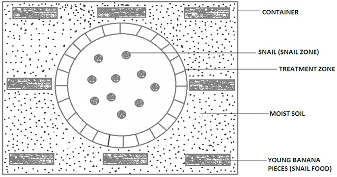 In the laboratory, 20 containers, each measuring 7 cm in length by 7 cm in width and 13 cm in height with a tight-fitting perforated lids were selected, washed, wiped and air dried for 20 minutes. Soil dug from the research centre was put in the containers and moistened with tap water. At the centers of the containers, rings or circles were demarcated and considered as treatment zones (i.e. where the different treatments were applied). Banana pieces from the immature fruits were placed at four corners of the dish (none treatment zone). Ten snails, each measuring about 3.8 x 1.5 x 1.3 cm for length, width and height respectively, were placed in the central portions of the circles or rings (non-treated portions at the centers of the containers) Figure 1. Each treatment had 4 replicates and there were 10 snails per replicate, implying 40 snails per treatment, making a total of 200 snails for the entire experiment.