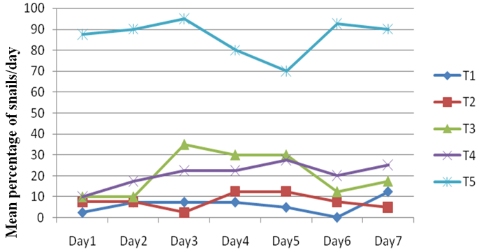 The percentage of snails at the snail zone (the percentage of snails not able to move across treatment barrier from Day 1-7) was significantly high in most treated containers than in the control containers Figure 2.