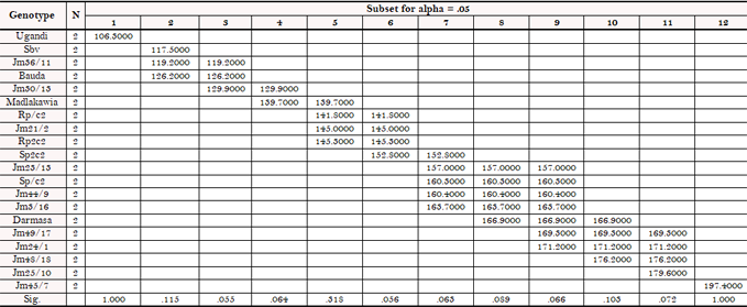 Duncan’s test for means grouped the 20 genotypes into 12 groups according to the plant height Table 3.
