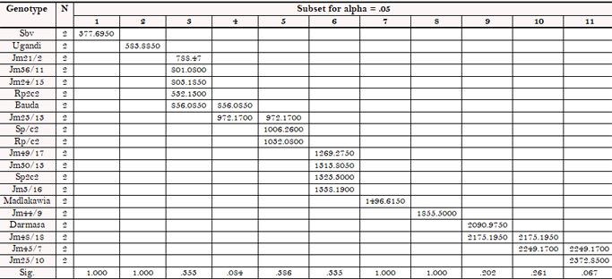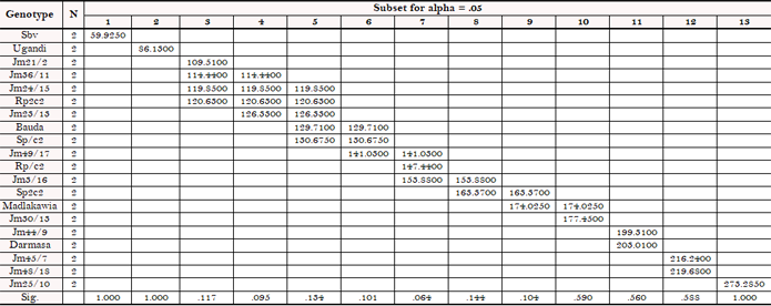 Analysis of variance reflected significant difference (P=0.000) between the different genotypes in plant height Table 2. The average plant height ranged between 197.4cm for JM 45/7; as the highest genotype; and 106.3cm for Ugandi the shortest. Dwarf plants (less than 50 cm in height) appeared among genotypes Ugandi and JM36/11.
