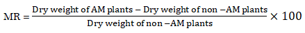 Microscopic assessment for calculating per cent mycorrhizal colonization (MC) in roots was carried out and the data is presented in Table 2. No sign of MC was observed in the root segments of uninoculated plants, thereby confirming the absolute absence of innate mycorrhiza. On the other hand, remarkable colonization was observed in the mycorrhizal roots at 50 DAS. Intensity of colonization by fungal endophyte in rhizobial treated plants was observed to be significantly higher than the respective –R+AM plants. Calculating plant responsiveness to mycorrhizas is a measure of mycorrhizal fungus effectiveness, thus variation in MR, with and without R application was calculated. Rhizobial application decreased plants responsiveness to mycorrhization Table 2.