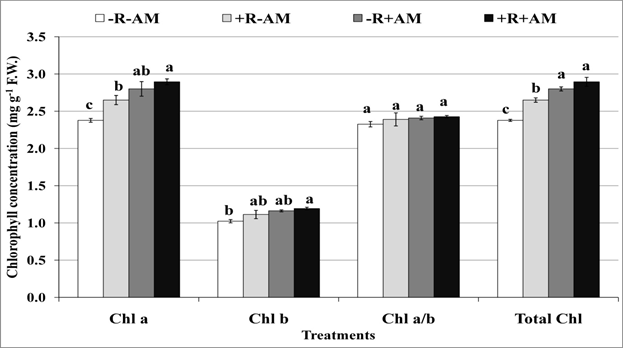 As compared to rhizobial inoculation, mycorrhizal colonization was resourcefully more competent in improving plant growth. Highly dense root system in mycorrhizal plants relative to non-mycorrhizal ones, could be due to mycorrhization mediated alteration in root morphology in a structural, spatial, quantitative and temporal conduct (Kapoor, Sharma, & Bhatnagar, 2008); thereby resulting in better rooting structure and superior total potential absorbing surface relative to the non mycorrhizal plants (Khalil, Eissa, El-Shazly, & Nasr, 2011; Zai et al., 2007). A higher improvement in root than shoot biomass in -R+AM and +R-AM groundnut plants (as indicated by increased RSR) pointed towards the facilitation served by rhizobia inoculation as well as mycorrhization to preferentially recover root system for superior rhizosphere exploration so as to improve capitalization of nutrient and water uptake. Higher allocation of photosynthates to the below ground plant parts and the resultant higher RDW and MC could prompt advanced trade of N and P by mycorrhiza in exchange (Fellbaum et al., 2012; Hammer, Pallon, Wallander, & Olsson, 2011) thereby ensuring superior benefits to those plants. Comparatively higher RWC in leaves of mycorrhizal plants could be due to AM induced superior root morphology (Kothari, Marschner, & George, 1990) superior root hydraulic conductivity even at low water potential (Kapoor et al., 2008) higher stomatal conductance insisting for added transpiration (Sheng et al., 2008) and higher solutes accumulation, thus improving plant osmotic equilibrium (Abdel Latef & Miransari, 2014). Higher Mg2+ and chl. concentration in mycorrhizal plants corroborated with their higher growth, advocating that higher requirement of fixed carbon in mycorrhizal plants could have enhanced Mg2+ uptake thereby improving chl. concentration which could have consequently improved CO2 assimilation efficiency (Wu, Zou, & He, 2010) and hence plant fitness.