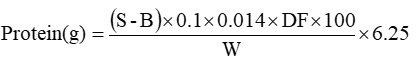 Protein(g): Protein was determined by using the Kjeldahl method. At first, 0.5-2g samples were taken in a Kjeldahl Digestion unit flask and 6.0g K2SO4,0.4g CuSO4 and added to 20 ml 98% H2SO4. Then, digestion at 4200C for 1 h 30 min. After cooling, 10 ml distilled water was added to hydro-lysates before neutralization and titration with 0.1 N.HCl. The blank solution was made in the same way. The amount of total nitrogen in the curd multiplied with conversion factor of 6.25 in order to determines total protein content. Protein Calculated by the following formula: