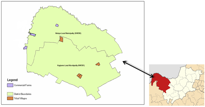 The study area falls within the Kagisano-Molopo municipal district (agricultural area). Within this area three (3) commercial land-users and three (3) communal villages were identified Figure 2.Figure-2. The study area in the Kagisano-Molopo municipal district (red part). Tribal Villages = Communal farming areas.