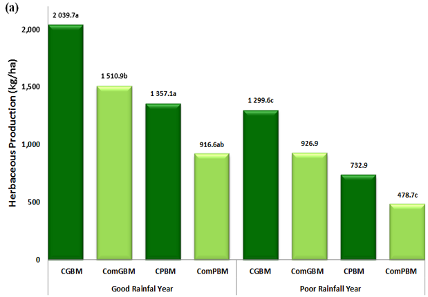 Figure-5. Biomass production of the benchmark (a) and grazed sites of the good and poor rangeland of the two land-uses (CGBM = commercial good benchmarks; ComGBM = communal good benchmarks; CPBM = commercial poor benchmarks; ComPBM = communal poor benchmarks; CGG = commercial good grazed sites; ComGG = communal good grazed sites; CPG = commercial poor grazed sites; ComPG = communal poor grazed sites) (P≤0.05).