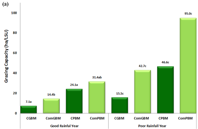 During the poor rainfall year the grazing capacity figure of the poor communal rangeland is indicated in Figure 6(b) as 150+ha/LSU – the actual grazing capacity figure for these rangelands is 519ha/LSU but for visibility purpose of the figure it was indicated as 150+ha/LSU. The grazing capacity figure of the poor communal rangeland differed significantly from the figures of the good and poor commercial and good communal rangelands.