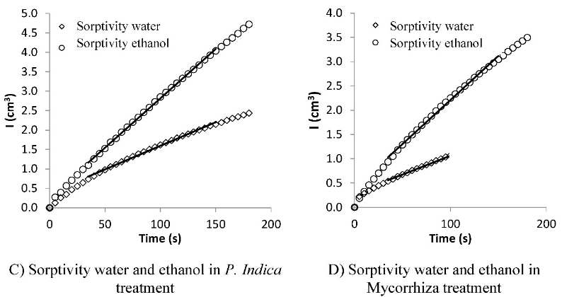 The inoculation of P. fluorescens reduced soil hydrophobicity at all levels of drought stress, though it was not significant at the third level of stress (25% AW). As a result of individual inoculations of S. indica, soil hydrophobicity increased significantly compared to the control at the second and third levels of drought stress (50% AW and 25% AW) but was not significant at the first level (Table 4). The simultaneous inoculation of mycorrhizal fungi with S. indica significantly increased soil hydrophobicity compared to the control at all three moisture levels. It showed the highest soil hydrophobicity across all treatments at the first and second levels of drought stress (80% AW and 50% AW). The simultaneous inoculation of S. indica and P. fluorescens significantly increased soil hydrophobicity compared to control at the second and third levels of drought stress but decreased at the optimal level of moisture (80% AW). In all three levels of drought stress, simultaneous inoculation of mycorrhizal fungi and P. fluorescens did not significantly change soil hydrophobicity. Nevertheless, triple inoculation of microorganisms significantly increased it at all levels of stress (Table 4). Based on the results, it was found that the soil hydrophobicity increased with decreasing water and ethanol sorptivity levels. The presence of mycorrhizal fungi (at all moisture levels) and S. indica (at the second and third stress levels) significantly reduced water and ethanol sorptivity when compared to CK. Additionally, P. fluorescens significantly increased the sorptivity of water and ethanol at 80% AW and 50% AW at the same time (Table 4, Figure 1 ).