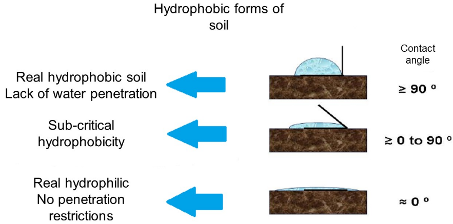 Hallett et al. demonstrated that organic compounds make soil hydrophobic, and the environment surrounding the roots of plants has higher soil hydrophobicity levels (Hallett, Gordon, & Bengough, 2003). Due to the lack of organic matter in the soils of dry areas, they have less water hydrophobicity than the soils of wet areas. Consequently, soil hydrophobicity decreases with decreasing soil moisture due to reduced plant growth and lower organic matter production (Doerr, Shakesby, & Walsh, 1998; Zhang, Chen, & Fan, 2020). In this way, repeated dry–wet cycles affect the development and durability of soil hydrophobicity (Cosentino, Chenu, & Le Bissonnais, 2006). Researchers report that adding microbes to soil increases soil hydrophobicity after a dry–wet cycle, but soil hydrophobicity decreases in subsequent dry–wet cycles (Cosentino et al., 2006). It should be noted that fungi increase soil hydrophobicity while bacteria decrease it Hallett et al. (2001). Rillig, Mardatin, Leifheit, and Antunes (2010) observed that the hydrophobicity of soil is increased by arbuscular mycorrhizae (Rillig et al., 2010), while Roper showed that bacteria reduce soil hydrophobicity by degrading hydrophobic compounds and producing biosurfactants, and use organic compounds as carbon and energy sources (Roper, 2004) (Figure 2).