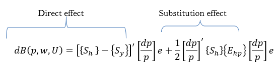 The last expression formally corresponds to the concept of Compensating Variation (CV), or the extra income needed to achieve the original level of welfare after the change in prices. It can be interpreted as the combination of a direct effect and a substitution effect: