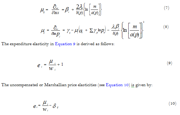 Elasticity is an important measure in demand analysis. The formulae for elasticities in the QUAIDS are given by Banks et al. (1997). The elasticities were obtained by first differentiating the budget share equation with respect to lnm and lnpj respectively (see Equations 7 and 8) to obtain: