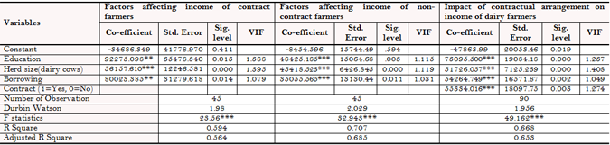 The econometric analysis (stepwise multiple regression models) was carrying out using the sample of contract, non-contract and overall impact dairy farmers. Different variables were expected to income of the dairy farmers these are age of the respondent, education level, family size, and number of dairy cows, farmland holding size, borrowing and contract. For analyzing the factors that affect the income of those who are involved in contractual arrangement or not, Stepwise multiple regression models were utilized. Existence of multicollinearity problem was checked by calculating VIF (variance inflation factor). No significant problem of multicollinearity was found. Durbin-Watson test indicated that there was no autocorrelation problem. Three variables (number of dairy milking cows, education and borrowing) were found significant for participation and non-participation at contractual arrangement from the out of seven variables, while contract variable was found significant for examining the overall impact of dairy farming. The coefficient of multiple determinations (R2) for three conditions were 0.59, 0.71 and 0.67 respectively and adjusted R2 was 0.56, 0.68 and 0.65 respectively. This denotes that 67% of the variation in the dependent variable is explained by the explanatory variables for impact on contractual arrangement. Furthermore, the adjusted R2 of 65% is significant and it has consolidated the goodness fit of the model. Hence, its econometrics is significant and reliable. The results from the estimated econometric model are given in Table 5.