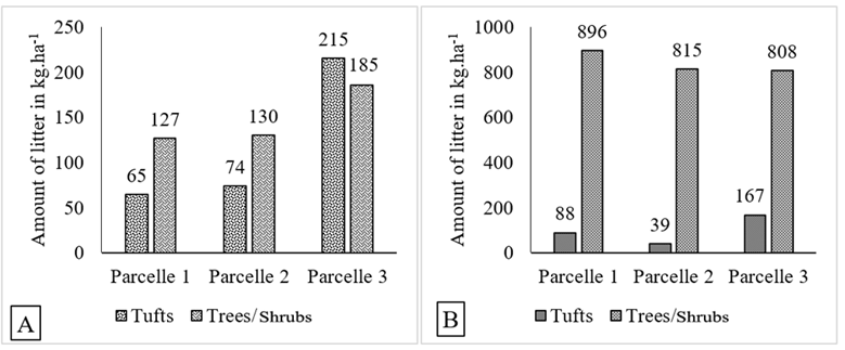 Figure 5 presents the quantities of litter recorded in the three plots by terroir. It can be seen that the quantities of FOM returned to the soil under ANR vary between the terroirs and plots. The quantities harvested in Dan Saga are four times higher than those recorded in Boussaragui. In fact, they are on average 937.62 kg.ha-1 in Dan Saga and 265.52 kg.ha-1 in Boussaragui. As for the quantities harvested per plot, they vary from 191.61 kg.ha-1 to 400.85 kg.ha-1 in Boussaragui. On the other hand, they varied between 853.75 and 983.91 kg.ha-1 in Dan Saga.