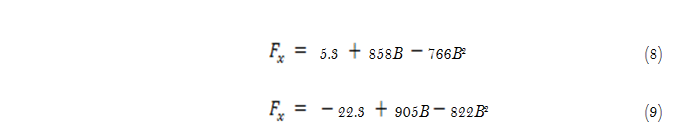 is exhibited by B, followed by A and least for C. This is because B has the lowest P-value than A and C. The squared main factor is also highest for B2, followed by A2 and least for C2. Their interactions are less significant as BC shows the least contribution. Using the backward elimination of terms, setting P-value at 0.05, terms that are less significant to equation (6) and (7) such as A, C, AB, AC, BC, A2 and C2 are removed to enhance the models. The reduced quadratic models are shown in equation (8) and (9) respectively