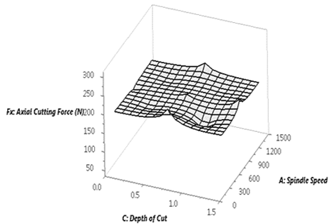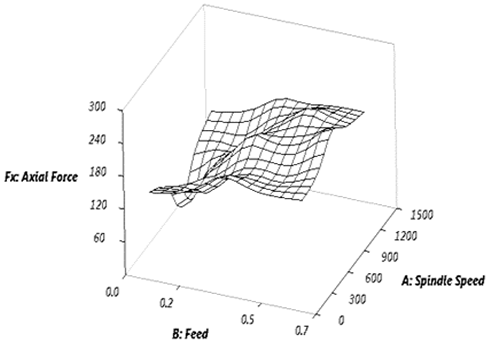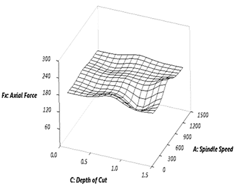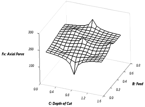 It is observed from Table 5that the greatest effect on the feed cutting force is exhibited by B, followed by A and least for C. This is because B has the lowest P-value than A and C. The squared main factor is highest for B2, followed by C2 and least for A2. Their interactions are less significant as AC shows the least contribution. Also, it is observed from Table 6 that the greatest effect on the feed cutting force