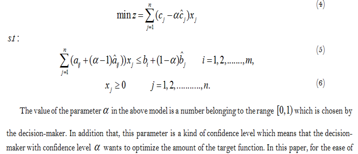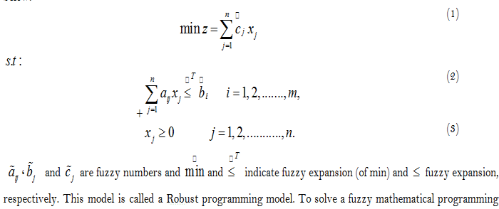The fuzzy mathematical model used in this paper belongs to the third category, commonly referred to as Robust fuzzy mathematical programming [10]. To clarify the matter, consider the fuzzy mathematical model below: