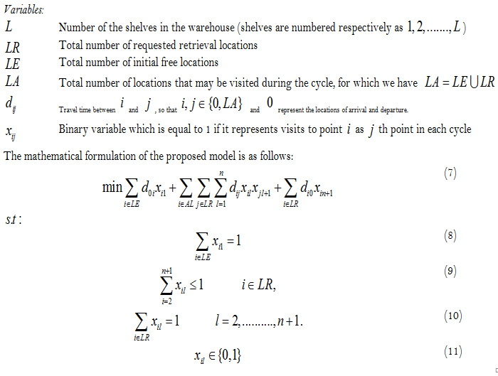 The total time spent by S/R machine is calculated and minimized using the following rule. This rule consists of three parts: the first part relates to movements of the machine from entry/exit points to the first free location for storage. The second corresponds to movement of the machine along the aisle during the retrieval, and the third part deals with the movement of the S/R machine from the last retrieval location to the entry/exit points. Constraint (8) expresses that the first location to be visited should be one of the initial free locations. Constraint (9) holds that at the most, each location is visited only once per cycle. Constraint (10) determines that the requested retrieval locations will be visited in the order from the second to  th point. Constraint (11) represents the range of model variables.