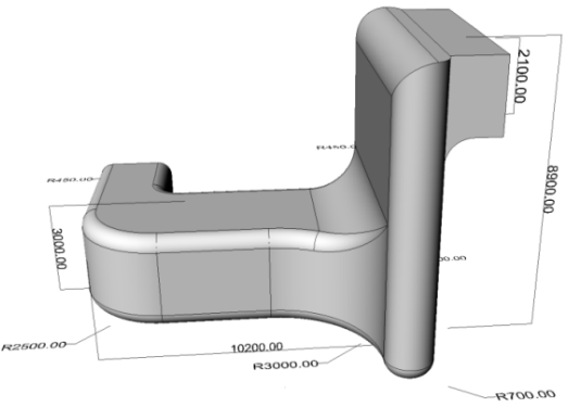 This project is a public environmental project, which requires a high level and verticality. The height of the gate wall is high. In order to make the concrete joint surface smooth and smooth, not to grow staggered joints, and at the same time in the second concrete pouring, there will be no slurry leakage, slurry hanging, honeycomb site, taking into account the actual situation of the project, In order to ensure the smooth and timely implementation of the template sub-project, notably the completion of the quality and quantity of the front end water conveyance corridor with the most complex spatial structure and several complex multi-curved surfaces, It is a prerequisite for the successful completion of the whole project and a difficult point in the construction process of the project. It must be visualized, simulated and coordinated through the BIM technology. To ensure the engineering quality, the advantages of optimality and statistics can be thoroughly analyzed and studied on the design, manufacture and installation of this complex and multi-curved heterosexual template. Because the front end of the original design of the project is a complex multi-curved irregular body, the configuration of the construction formwork is exceptionally complex, and the related structures can be seen in Figure 8 and Figure 9.