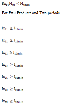 Where, in the first constraint (1) Dpt denotes forecasted customer demand of the pth product in period t and represents the sum of regular time production, inventory levels, backorder levels essentially should equal market demand. The second equation ensures that the production amount does not exceed machine capacity and the third constraint determine the level of inventory. Model is expanded and solved for 2 products (P=2) and three periods (T=3). The expansion is given in the Appendix.