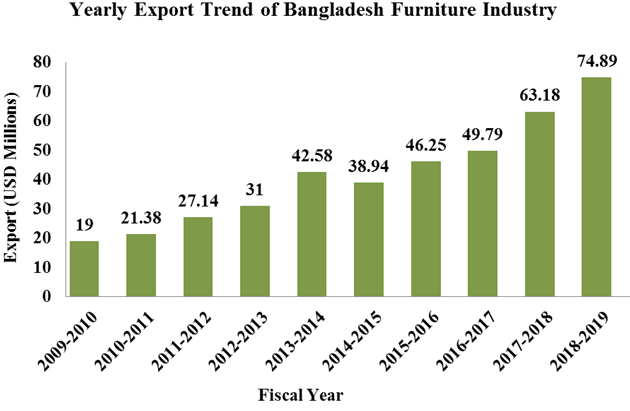 Bangladesh Export Promotion Bureau data shows that in the last fiscal year (FY) of 2011-12, Bangladesh achieved 16% export growth in furniture to earn over USD 31 million. Figure 2 showed that the volume of furniture export was USD 19 million in the fiscal year 2009-10, while it amounted to USD 21.38 million in FY 2010-11, USD 27.14 million in FY 2011-12, USD 31 million in FY 2012-13, USD 42.18 million in FY 2013-14, USD 38.94 million in FY 2014-15, USD 46.25 million in FY 2015-16, USD 49.79 million in FY 2016-17, USD 63.18 million in FY 2017-18, and USD 74.89 million in FY 2018-19 (18.53% export growth) [4].