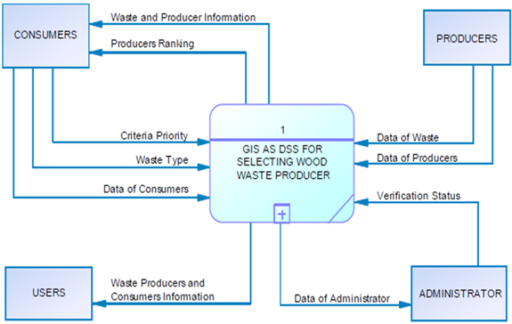 A study by Susanty, et al. [16], found that collection and transportation of wood waste is the main problem of recycling wood waste. Specifically, the problem related to available information about the wood waste that incorporates the producer to generate the wood waste and finally use or recycle it. In this study, they have designed an application of internet GIS by using Software Development Life Cycle (SDLC) process. For solving the problem, the SDLC process includes some significant information and databases like furniture manufacturers (Small and Medium Enterprises shortly SMEs) name, location and phone number as they are the producer of wood waste, the amount and price of the wood waste, wood waste collector name, location and phone number, delivery charges for each type of transport medium used and the total distance the particular materials to be conveyed [16]. Figure 8 is a contextual diagram that represents the proposed SDLC system indicating the boundaries of the system, interacted outward entities with the system, and the main information streams between the entities and the system. The proposed SDLC system was applied between two districts of Indonesia Jepara and Surakarta because most of the SME furniture industries are located there. This proposed model can also be applied in the furniture industry sector of Bangladesh because Bangladesh is also now emphasizing the environmental issues and recycling of hazardous wastes.