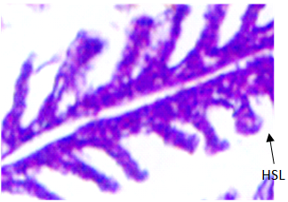 The gills of Hemichromis fasciatus in Opa reservoir showed normal primary and secondary lamellae. However, hypertrophy of primary lamellae was observed as shown in Plate 1.1a and epithelial lifting Plate 1.1e. As shown in Table 1, the two lesions in the fish gills are in first-stage of severity. The photomicrograph of gill section in H. fasciatus of Igun reservoir showed fusion of secondary lamellae Plate 1.1b, hyperplasia of secondary lamellae Plate 1.1d, rupture of gill epithelium and curling of secondary lamellae Plate 1.1f. Two of the lesions in the fish gills are in first-stage of severity and three lesions being in second-stage of severity Table 2.
