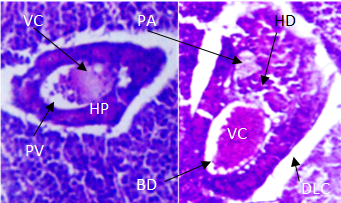 Result of the histopathological examination of H. fasciatus liver in Opa reservoir include splitting at the wall of central vein as shown in Plate 1.3a; hepatopancreas degeneration and degeneration in liver cells Plate 1.3c and nucleus hypertrophy Plate 1.3e. Also, each of the two lesions in the fish liver are in first and second-stages of severity Table 1. Histopathological alterations in the liver of H. fasciatus in Igun reservoir are shown in Plate 1.3b, with vascular congestions in central vein, splitting at the wall of central vein; vascular congestion in the portal vein, bile duct, and portal artery. Degeneration of liver cells and hepatopancreas degeneration was also observed Plate 1.3d as well as nucleus hypertrophy as shown in Plate 1.3f. In Table 2, two of the fish liver lesions are in first-stage of severity while six lesions belonged to second-stage of severity.