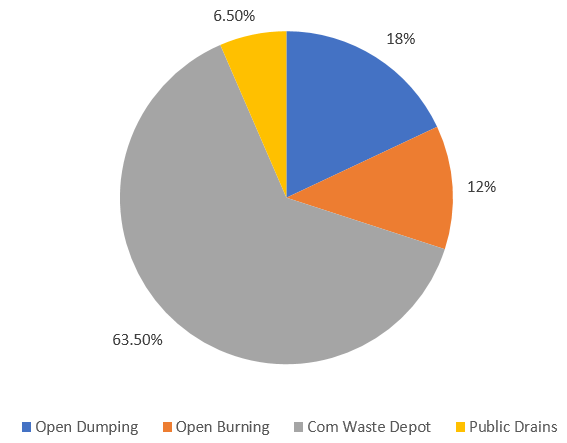 In addition, 47.5%, which is nearly half of households, reported the absence of a sanitary waste bin in their house, while 18% disposed of their waste by open dumping, 12% by open burning, and 6.5% by dumping their trash into the public drainage system Table 3.
