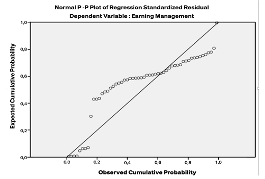 Descriptive statistics are used to describe the data characteristics of each variable in this research. The analytical tools used are the average value, maximum value, minimum value, and standard deviation. Descriptive statistics describe data in a way that is clearer and easier to understand. Table 1 above presents descriptive information on the research variables, namely independent board of commissioners, independent audit committee, managerial ownership, dividend policy, and earnings management. Based on the results in Table 1, earnings management (Y) that occurs in banking companies has an average of -8.1476; the negative result indicates that the average earnings management in banking companies is carried out by reducing corporate profits by -8.1476 units with a standard deviation of 2.0195. The highest earnings management (maximum) was found in Bank Mandiri (Persero) (4.2865), and the lowest (minimum) was found in Bank Nusantara Parahyangan Tbk (-5.9453).