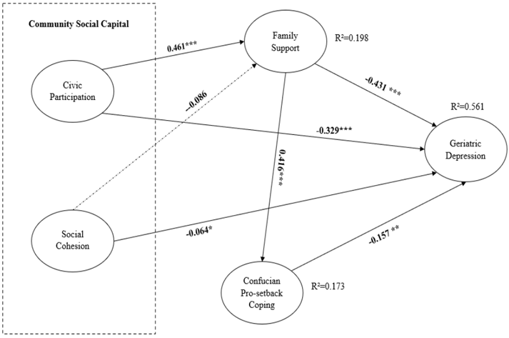Keywords: Community social capital, Civic participation, Social cohesion, Family support, Confucian pro-setback coping, Geriatric depression.