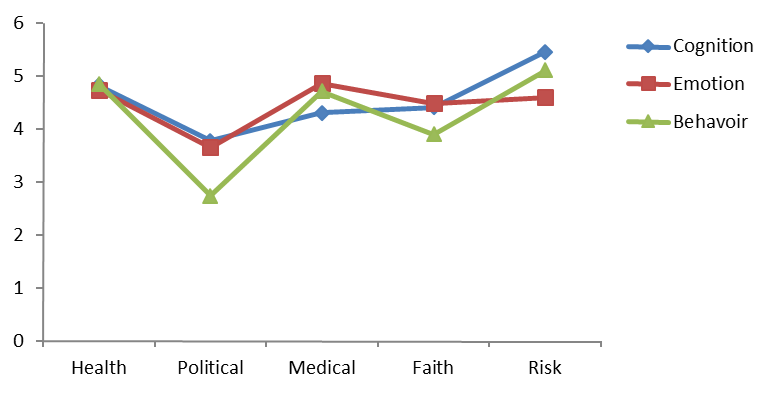 A total of 5 kinds of social attitudes and 3 dimensions of BEC were mutually analyzed by ANOVA, as shown in Figure 1. Overall, the comparison showed that health, medical, and risk attitudes were higher leveled than political and faith attitudes. The main effect of social attitudes was significant, F = 27.923, df = 2/444, MSe = 0.896, p = 0.000. Additionally, cognition (C) and emotion (E) were more highly leveled than behavior (B). The main effect of BEC was significant, F = 70.189, df = 4/888, MSe = 4.015, p = 0.000. BEC were not differentiated in their health, medical, and risk attitudes, compared to political and medical attitudes. The interaction of social attitudes and BEC was significant, F = 36.433, df = 8/1776, MSe = .897, p = 0.000. The overall comparison of the social BEC suggested that the social attitudes were differentiated in each activation level to counter the crisis of the pandemic, and as observed by Lee et al., the BEC were not synchronized but individualized to compose an attitude to social situations.Figure 1. 5 kinds of social attitudes and 3 dimensions of BEC (N = 223).
