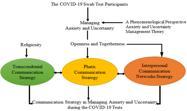 Finally, the strategy in managing anxiety and uncertainty of information while waiting for the results of the COVID-19 swab test can be carried out by using transcendental communication strategies, phatic communication, and forming a communication network with people closest to them. These three communication strategies have a strong relationship with success in managing anxiety experienced by COVID-19 swab test participants in Indonesia. The relationship between the management of anxiety and uncertainty carried out by COVID-19 swab test participants and communication strategies is described in the following Figure 1.