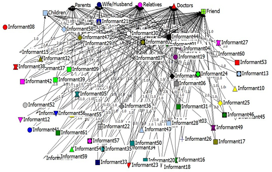 An overview of the communication network between the informant, doctor, wives/husbands, parents, children, relatives, and friends can be seen in the sociogram map (Figure 3).