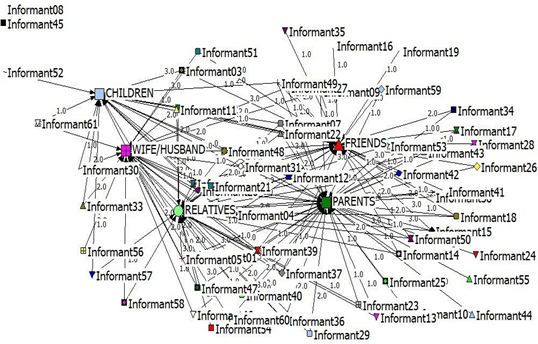 The decription of the communication network between the informant and parents, wives/husbands, children, relatives, and friends can be seen in the sociogram map (Figure 4).