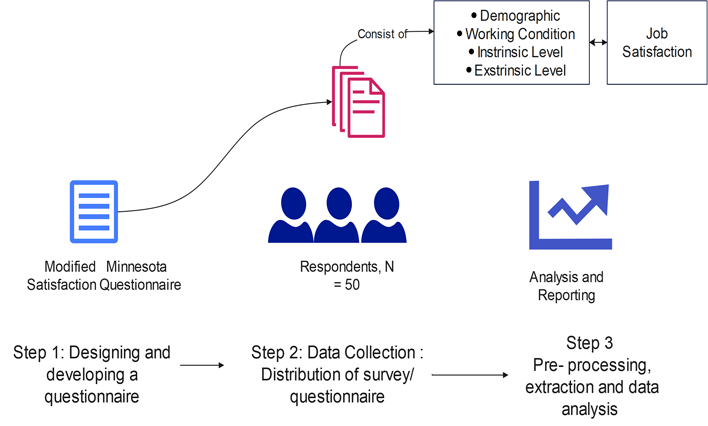 Figure 1 presents an overview of the methodology that includes the design and development of questionnaire, data collection methods (survey, online and face to face), and data analysis. The questionnaire emphasized on job satisfaction based on several variables such as the demographic profile of respondents and job satisfaction level. The Minnesota Satisfaction Questionnaire (MSQ), consisting of 21 items, was designed and modified for this study. The MSQ measured both intrinsic (i.e., how individual felt about their work duties) and extrinsic (i.e., how individuals felt about the aspects of their working conditions external to the work itself) job satisfaction levels. Beforehand, the questionnaire underwent a preliminary assessment and pilot study to ensure the reliability index, which was acceptable. Some amendments were also made in terms of language, interface, and word selection. The reliability of the questionnaire was conducted to ensure there was no bias, and was suitable in the Malaysian employee’s usage context. The questionnaire was distributed to maintenance personnel (oil and gas contractors) using the face to face approach. A total of 100 questionnaires were distributed, however, only 50 were completed and no missing values were detected. Random sampling method was used to select the sample.