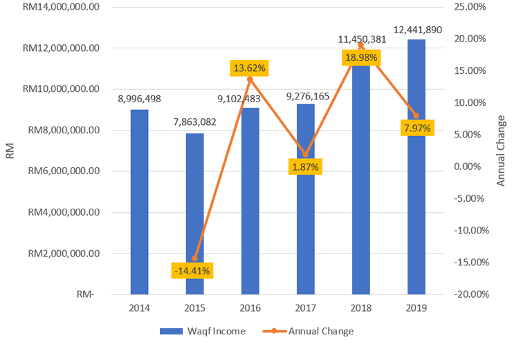 In 2018, income increased by 18.98 percent, with a collection of RM11,450,381 compared to the previous year in 2017 (RM RM9,276,165). In addition, the waqf fund’s overall income increased in 2019, reaching RM12,441,890, an increase of 7.97 percent, marking the largest income collection in the six-year period. Because the Muslim community has placed a high level of trust in the PWS to handle their waqf property effectively, the growth in waqf fund income can be witnessed year after year due to the disclosure of good waqf reporting every year.