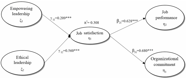Recently, the corporate world faced economic downturn during COVID-19 pandemic and reduced the financial performance. Employees' job satisfaction has a crucial role in enhancing the company's performance. Furthermore, the managers’ leadership style also contributes to employees’ job satisfaction. The managers' behavior also strongly correlates to employees' satisfaction in the workplace. It implies the companies revise their leadership and standard (Albrecht & Andreetta, 2011; Cheong et al., 2019). Effective and efficiency are related to honesty, integrity, and justice. Leaders concerned about the management decision-making process with respect, sincerity, and honesty possibly strengthen their relationship with employees. The leader also needs to allocate specific effort and time to understand intellect and humanism to enhance their knowledge. It is possible to inspire and respect their workers and other people (Håvold et al., 2021; Hoang et al., 2021). Thus, causality flows among variables possibly occurred. Prior studies validated the effect of managers’ empowering leadership on job satisfaction, such as  Rao Jada et al. (2019) and Salas-Vallina et al. (2020) which revealed that empowering leadership helps the workers' positive energy and motivation, and satisfaction in the workplace. Similarly, empowering leadership significantly affects employees' job satisfaction in the private sector (Kundu et al., 2019; O'Donoghue & van der Werff, 2021). Hence, we propose the following hypothesis: