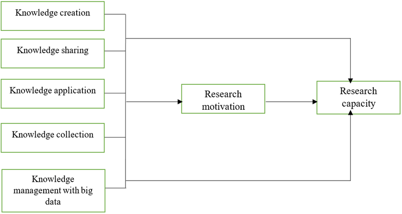 In accordance with the aforementioned definitions and evaluation criteria of faculties' research competence, a knowledge management model is required to promote these competencies. Procedures, leaders, managers, colleagues, and knowledge management results have been demonstrated to influence the performance of research. Arntzen, Worasinchai, and Ribiere (2009) showed that, in addition to the basic factors including creating, collecting, storing, and using knowledge, the factor of sharing also has an important effect on the research capacity of lecturers at universities. Salo (2011) showed that the factors of the knowledge management model, such as knowledge creation, knowledge collection, and the use of knowledge, have a strong influence on the research capacity of students and lecturers. Bader, Haneen, Ala’aldin, Ali, and Ibrahim (2016) also showed that factors related to knowledge management methods provide lecturers with the opportunity to connect with other scientific groups in their communities through social networks, coding, personalization from impact measurement to research motivation, and the research capacity of lecturers (Ferraris, Mazzoleni, Devalle, & Couturier, 2019). Moreover, a number of studies have also confirmed the influence of knowledge management on faculties' research capacity (Al-Abbadi, Alshawabkeh, & Rumman, 2020; Gyemang & Emeagwali, 2020; Huie, Cassaberry, & Rivera, 2020). In line with the above-mentioned discussion, the following hypotheses were developed in this study: