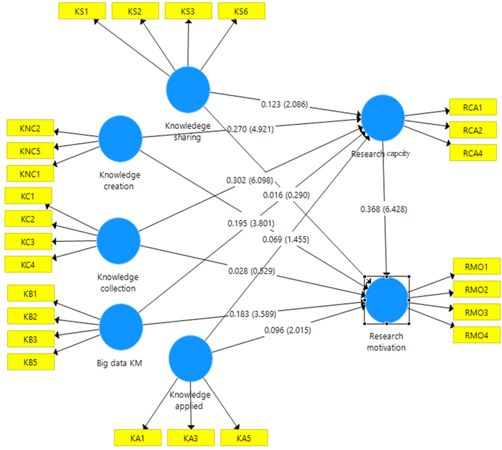 Previous studies do not all agree on the scale of a faculty's research (Kotsemir, 2012). In addition to two scales derived from previous studies, the two proposed scales in the current model are suitable for testing. Similarly, the scales of research motivation and the scale for the new factor, i.e., knowledge management with big data, are also unique to this study. While Ardito et al. (2019) only described knowledge management with big data, this study has shown the reliability and relevance of the scales in the knowledge management model.